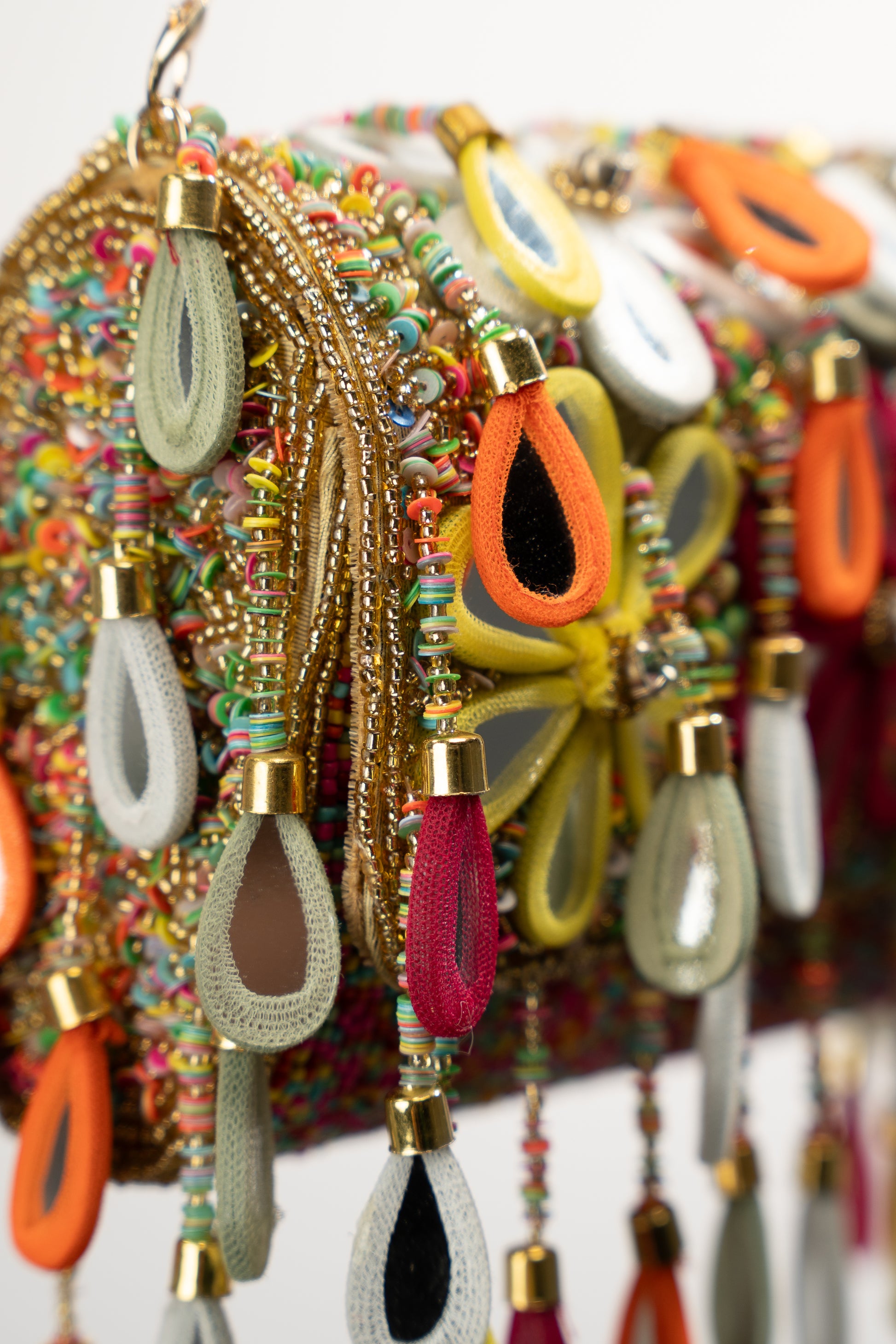 A handcrafted statement piece featuring multicolour micro-bead embroidery, oversized mixed mirror-glass teardrop pendants, and a fully beaded shoulder strap.